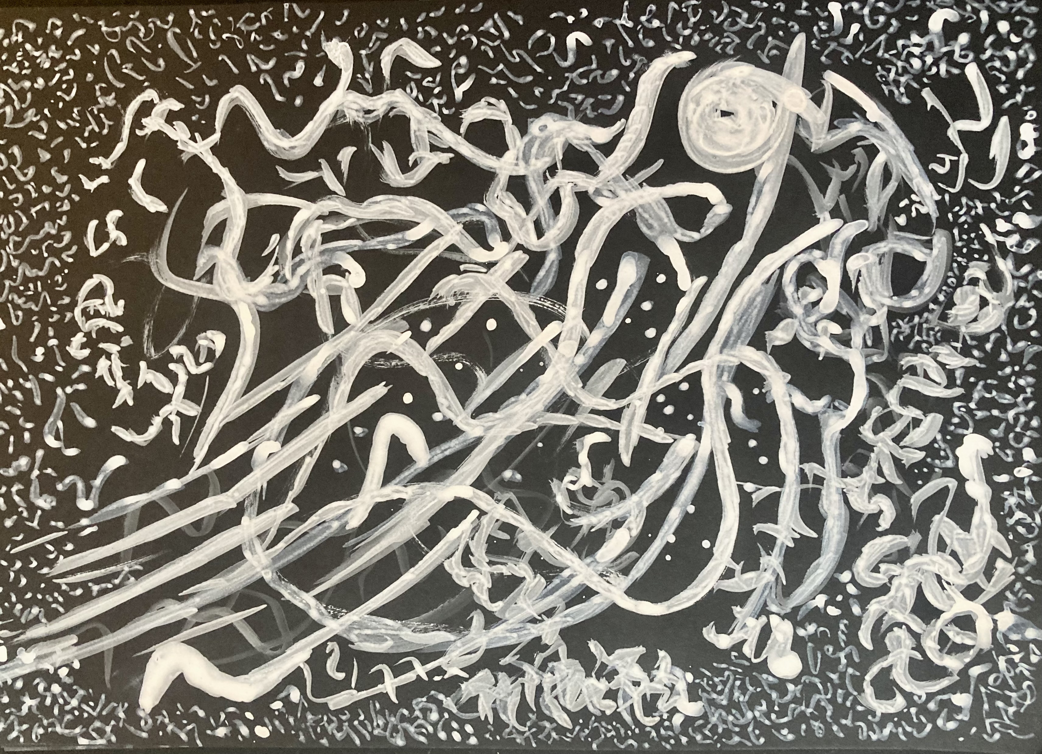 Encre de chine blanche sur papier noir.